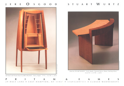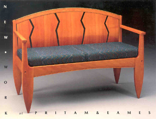 Binzen continued: "Early this summer, when Pritam & Eames mounted a 20th anniversary exhibition, the gallery was crowded with furniture by many of the most accomplished and active makers. Of the 26 included in the show, more than half were veterans of the inaugural exhibit. The greatest strength of this year's show was its breadth. With work by Judy Kensley McKie, Jere Osgood, Kristina Madsen, Alphonse Mattia, Hank Gilpin, Wendy Maruyama, David Ebner, Rosanne Somerson, Michael Hurwitz, James Schriber, and other distinguished designers, a furniture historian could easily have conducted a stirring seminar on the recent history of the craft (East Coast division, primarily) without recourse to anything but the pieces on display."