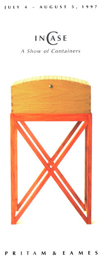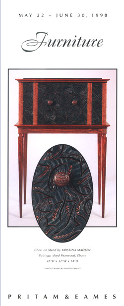 Throughout the 1990s, Pritam & Eames continued its mix of group, featured, and one-person shows. It also initiated the P&E Editions series. By this time, the furniture makers associated with the gallery had evolved distinctive, well-defined styles in their work, which they continue to refine throughout the 1990s. Explosively new and original work by two furniture makers emerged during this period: Kristina Madsen in the mid-1990s and Brian Newell at the end of the decade. By 2001, Pritam & Eames felt fortunate to have been in place for over 20 years, to have hosted a consistently high level of studio work and, also, to have been the beneficiary of a loyal and discerning public.