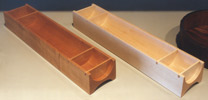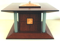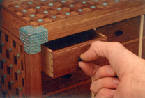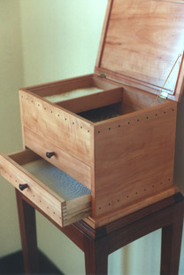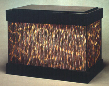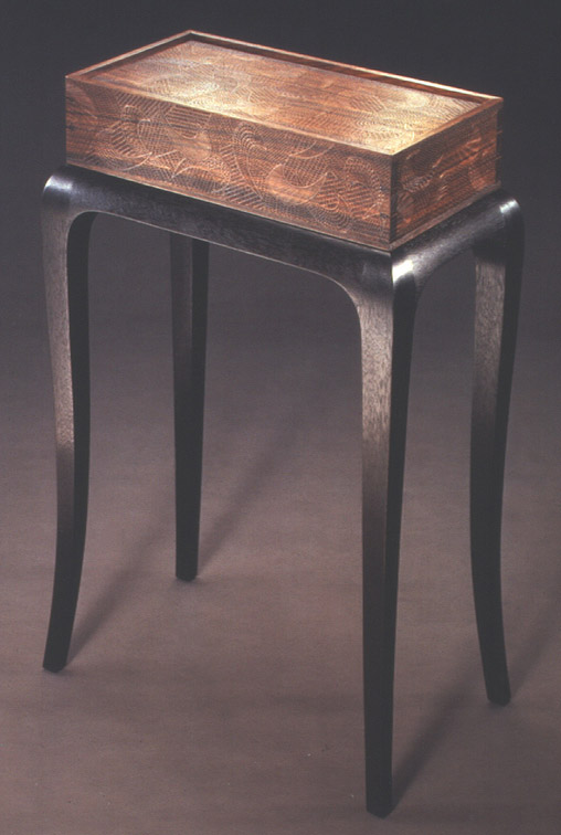 The jewelry box from Robert Ingham represents the first of a series of complex small cases to come from this English maker. Ingham had already spent many years in charge of studio production at Parnham House under the direction of John Makepeace. The Modrian-style linear graphics of the aesthetic of this box give it a different look from anything happening in the American furniture scene at this time. The delicate use of handmade hinges and distinct materials makes one think of Krenovian touches, although the strict geometry of the box would be at odds with this comparison. His use of color, in this case red dyed sycamore, expresses more of the freedom of American thinking. This strict geometry is nicely balanced by the very active, organic figure of the olive wood. Ingham explained that his own personal workplace at the school was not large, and he had learned to develop intricate highly controlled techniques that were aimed at constructing these case pieces.