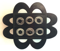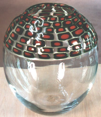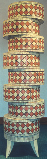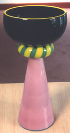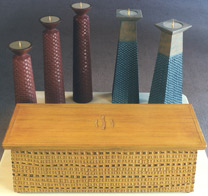 The small chest from Judy McKie represents one of her non-sculptural works with its emphasis on two-dimensional pattern. The pattern itself strikes you as large for the chest, and its two dimensionality seems only technical as the grid itself offers the focus of different shapes on different views, some pushing out from the plane, others imploding. The wild and primitive nature of the grid gives this piece almost a fun house, or circus, feel. The use of color helps to illustrate the dynamics of the shapes but is kept to muted, almost faded tones, as if this chest were found in an exciting exploration of the attic.