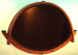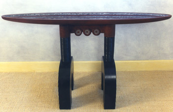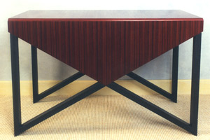 Every accomplished maker creates work that comes to be seen as his or her signature piece. For Walker, the bubinga sideboard or console is one such piece, and one well remembered by gallery visitors. Within Walker’s body of work, it is unusually sculptural. The boat shaped volume of its top has less to do with functionality, although it does house two narrow drawers, and has more to do with form: in this case, a streamlined and water borne volume floating serenely above its supporting table base. The curve of the rail of this table base strengthens the form, suggesting surface tension and buoyancy. The same curve is nicely reversed to add visual tension in the lower stretcher, which runs lengthwise between the legs. This piece again reflects more the quality of Saarinen’s work and less traditional table architecture. The single tonal drama is produced by a maple veneer rectangle that is centered on the top.
