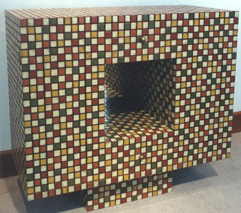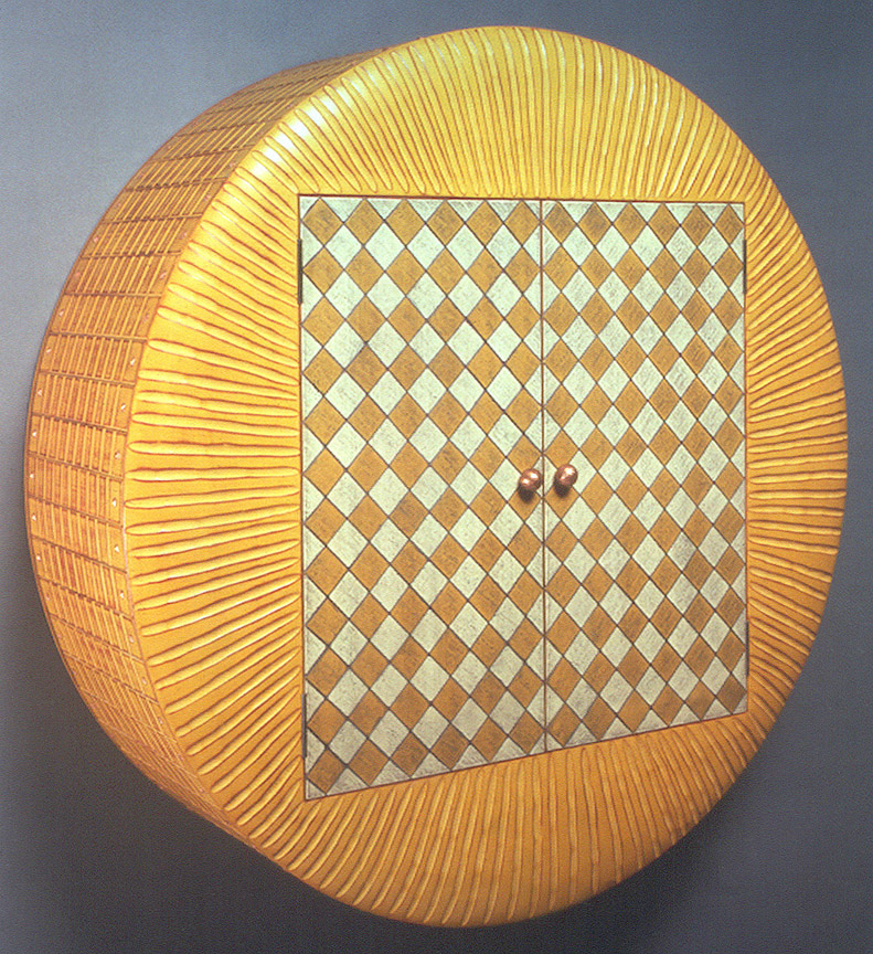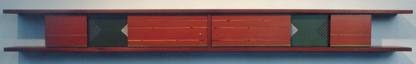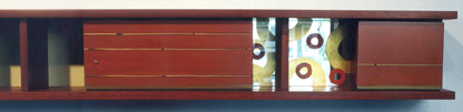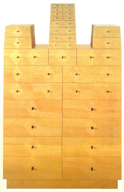 The two largest pieces in the show were a tall chest of drawers and a tall freestanding cabinet. The chest of drawers suggests a pyramid construction in that the four large bottom drawers each step in successively from the base. This stack of four drawers itself provides a base for the top tower of ten drawers and door. This piece is distinguished by the colored monotypes under glass that compose the drawer fronts. The diamond pattern of the monotypes, intentionally irregular, is reminiscent of the expressive dynamic of flag graphics. The reds, orange, and pale blues all with a light field grinning through make the colors seem weathered. The pediment and top molding are without gesture and simply frame this stack of drawers.