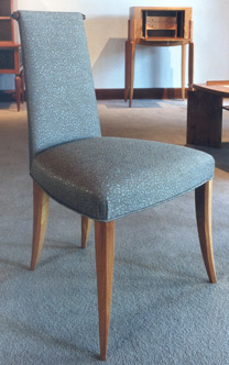 Eight chairs accompany the table. In the solid wood fan-back dining chair, you can see Walker looking back at Eero Saarinen. This, however, is no Arts and Crafts-era chair, but a fully conceived contemporary design that would appear on the cover of Fine Woodworking later this year. To be comfortable, the coopered solid back was not only curved around the back, but also fitted to the incline of the spine and shoulders. It is kept as a simple unbroken form that joins into an upward extension of the rear legs. The legs themselves reference the dining table, as do their aprons. The upholstered seat sits into the chair’s frame, upping the difficulty of the process considerably over the use of an overlapping upholstered form.