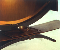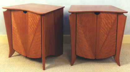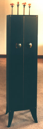Of the pieces represented on the poster, Jere Osgood's Shell Desk 2001 and Brian Newell's Spider Cabinet certainly dominate as far as accomplishment. The carcass of Osgood's desk sits like a finely domed helmet atop one of his classic pedestal bases. The only interruption to the sections of vertically flowing Macassar ebony is the bottom centered pulls of the two doors. They sensually mirror the parting of the pedestal legs. The interior design of four drawers and curving partitions has the serene architecture of a cathedral interior.