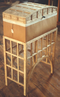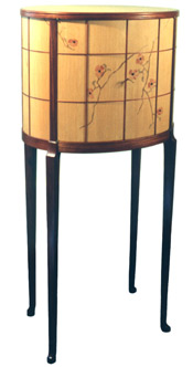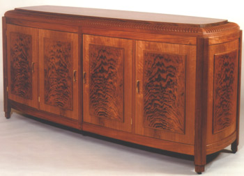 The Spider Cabinet brought Brian Newell's work to the attention of a knowledgeable public, both clients and his peers. The design of the cabinet's compound curving brick-built carcass focuses on the center of the facade and its pierced carved grill. The free hand carving of the grill is a significant embellishment in this piece; this kind of carving has been a strong element historically for Newell (see his tall cabinet 1987). The Spider Cabinet's six long legs and sprung stretchers give the piece considerable tension.