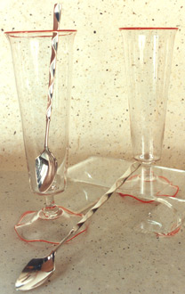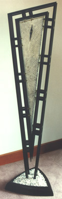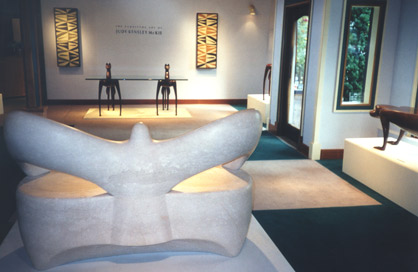 NOTES: The time line in the exhibition poster takes a look back pictorially at some of the work that debuted at the gallery during its first 20 years. The pictures surrounding the time line show many of the pieces contributed to the 2001 show. Typically, some work for the show was not ready in time for photography, like Janene Hilliard's Ivory Reed Lamp; Tom Hucker's apple wood low table; Tom Loeser's Rocker for Four, and Fran Taubman's forged steel Vine Console. Kristina Madsen's time intensive chest of drawers was finished later that summer.