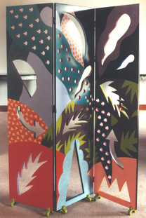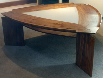 Fran Taubman's Vine Console would later appear in Architectural Digest. Tom Loeser's witty bench, Rocker for Four, was in fact a rocking bench and would accomodate four bodies by virtue of iridescently colored, gouged carved seating places. Tom Hucker's table blended the country charm of the material, apple wood, with his sophisticated sense of form, in this case, a triangle with curved sides and fin-like supports.