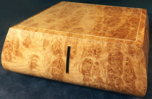 Michael Cullen's small, exquisite Leaf Box gains its special quality in the way the lid's handle stands out from, but is perfectly integrated with, the theme of the carving. The complementarity of colors between handle and box enhances this effect.