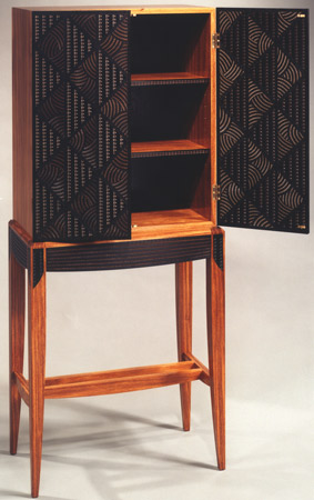 Paul Harrell, an experienced maker in his own right by this time, has in this case offered a stationery box that also closely reflects the thinking of Krenov. Zivko Radenkov’s elm and satinwood cabinet is his first attempt at the oval form since his perfectly rendered 1986 cabinet. The personality of this cabinet, however, is bolder and thus champions of the first oval cabinet might not be as taken with the second. It is slightly larger, and the marquetry is less restrained. Also, the satinwood field has a luminescence that makes one think of Louis XIV, rather than the almost Zen-like restraint of the earlier cabinet.