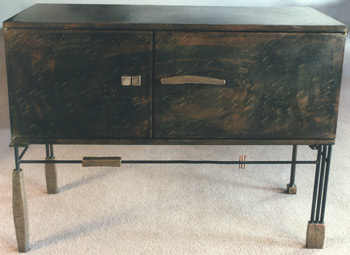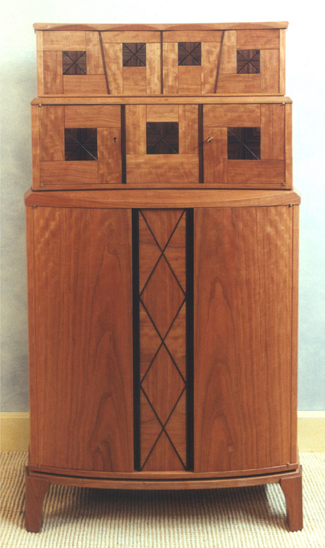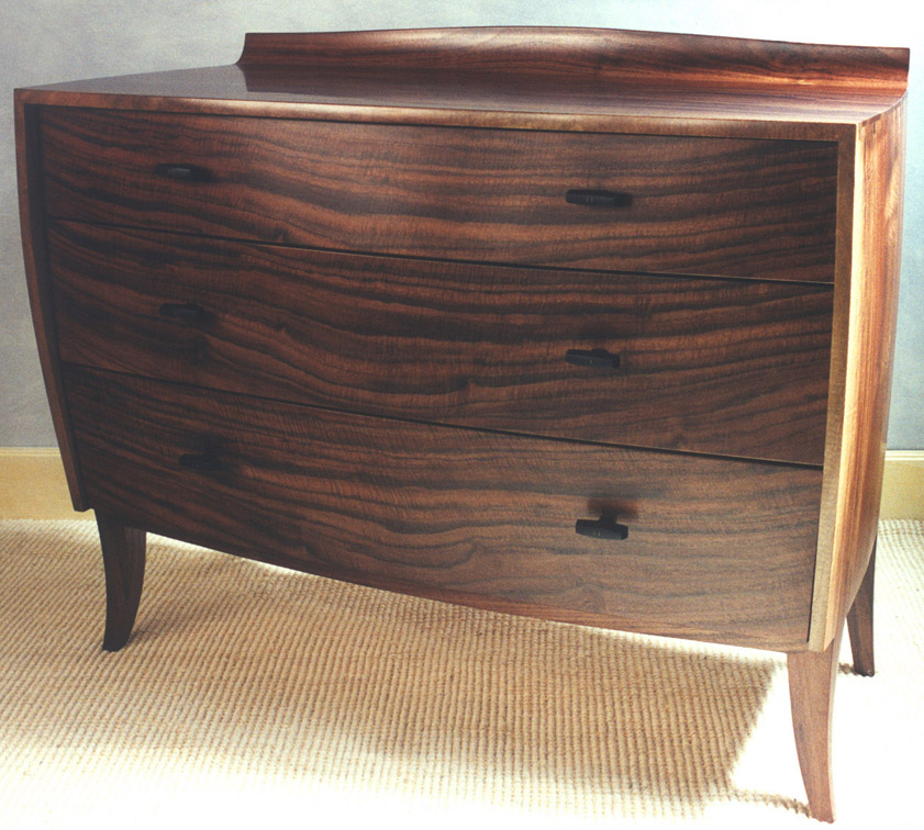 NOTES: The rosewood lingerie chest by Greg Smith needs to be highlighted here. Once again he accomplishes a beautiful piece with impeccable craft. The calligraphic pulls in forged iron demonstrate a second mastered skill by Smith. The stepped back effect as the piece ascends motivates the descending scale of the drawers. Three jewelry drawers behind the doors are half cabinet width.