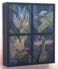 The Flying Bird Cabinet is a shallow cabinet whose carved and painted limewood doors were also the basis for a linocut series of these birds in flight. On the cabinet, the door panels occupy almost the entire front and through shallow carving of the limewood, McKie has created the lightly dimensioned detail of the birds in flight. The bird forms are in black and white with the carved lines retaining the light tones of the limewood. McKie uses deep tones of blue and green in the background field of flora to lift these birds away and give depth. Each of the four panels is unique, whereas it would have been simpler to reverse the diagonally opposite forms.