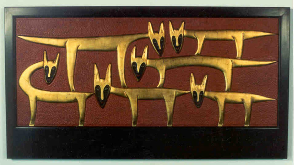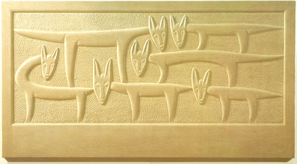 The second headboard has exactly the same form but the bodies of the dogs are done in gold leaf. They stand proud of a deep red painted field that is bordered by a black frame. A part of the dog’s faces, including the eyes, are painted black. In the maple version, we are mainly aware of the intent gaze of the five pairs of eyes. In the second headboard, the gold leafing of the dogs emphasizes their forms, the black of the faces de-emphasizing the gaze. They appear more as magical creatures in a dramatic landscape.