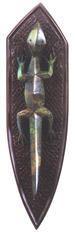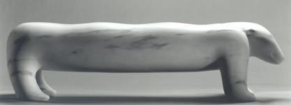 The Jaguar Table illustrates McKie’s great talent for combining a useful piece of furniture seamlessly with her sculptured animal forms. Rather than terminating abruptly, the long flat back of the jaguar creates a line of tension that extends to the neck of its taut form. In the detail of the head, notice the simplified abstraction that suggests the nose and eyes. As said before, the abstraction of McKie's detailing has kinship with Alaskan or African carving and little to do with the romantic realism of a Frederic Remington mountain lion.