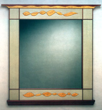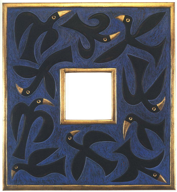 The two mirrors in this show were the same scale and format, but with entirely different personalities. Formally, the mirrors are unusual in that they are squares. But much more unusual is the proportion of the square of mirrored glass to the frame itself, hardly more than 10%, suggesting more a forbidden view than a place to review and arrange oneself. It is almost like the small window in the door of a private club. Beyond this, the personalities of the two mirrors could not be more different due to McKie’s bas-relief carved patterns. In the first, four snakes coil around the mirror. Their bodies are dramatically covered in gold leaf, which is augmented by red and black pigment. The second mirror, as self-effacing as the first is dramatic, uses a delicately carved vine motif with no color differentiation in the wood surface except for the shadow cast by the carving.