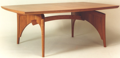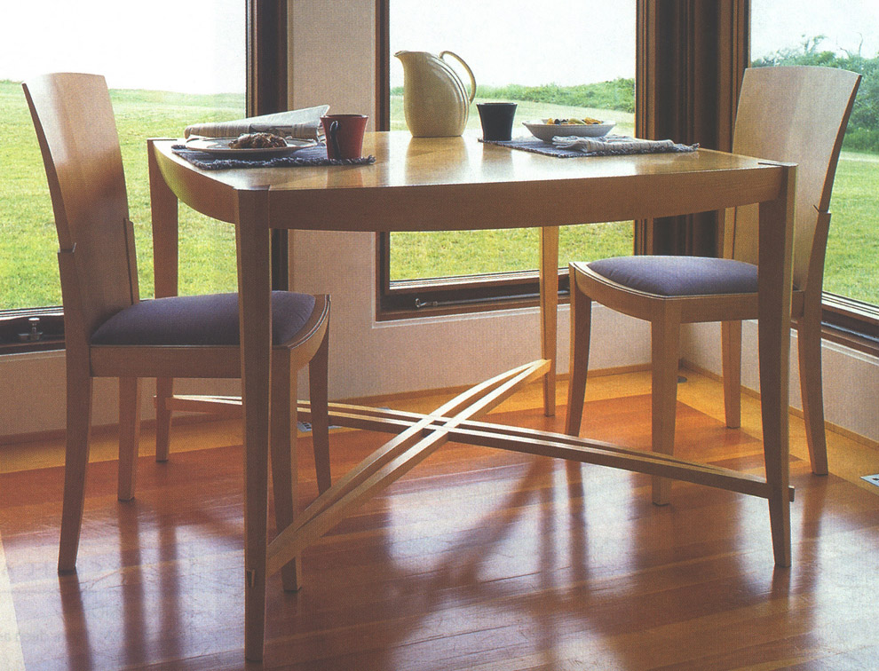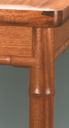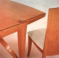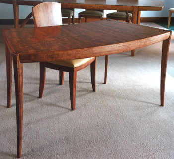 The second feature of this table is that the top is not just supported by four legs, but the legs are set into the top in such a way that they establish a dramatic design character for the entire table. By joining the legs at 45-degrees to the apron sides, they seem to stand proud of the apron and define the projection or extension of the table itself. This impression is augmented by their interesting shaping. Three forward facets create the surface that project out and into the room. The leg, itself, intersects with the table's apron with two larger facets which themselves join to define a corner of the eating surface. The part of the leg that faces towards the table’s interior is completed with a rounded section. At cross section, this is a complex shape. The three flat surfaces are flat only in their width, as these faces travel down the leg to its foot, the leg has a gentle saber curve. The crisp intersection of these facades is one of the table’s tailored features.