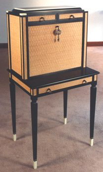 John Dunnigan's Bon Heure du Jour desk references earlier work of his with its tiered or stepped legs. This is strictly an elegant piece, without the use of exaggerated elements that mark his work of the late 1980's. His accompanying chair is in keeping with this piece, representing the essence of his best chair designs.