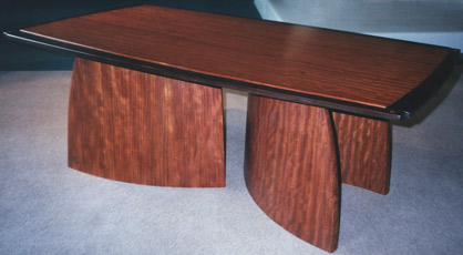 The downward curved surface of the apron supports and reinforces the curves found in the legs. With unusual perception, Walker combines the tailored aspect of precise intersections with the flowing and biomorphic quality of his curves. The apron also gives the top a dimension of depth and solidity.