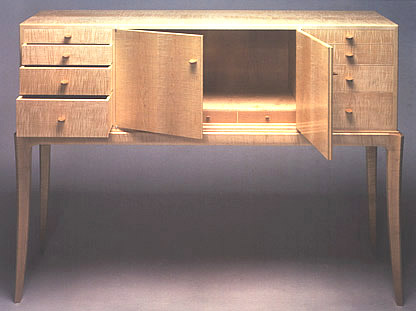 Walker’s Silver Cabinet or sideboard was another candidate to steal the show. In this piece, he looks back to his 1987 sideboard in ash that set the theme for his affection for long, chest-high cabinets that sit on a delicate, elegant table base and whose legs seem improbable supports for the cabinet mass they carry. In the 1987 piece, Walker used a double horizontal stretcher at the top of the legs to create structure with no lower leg stretchers. Here, too, he follows this formula of simple, uncluttered elegance where everything depends on the joinery at the legs’ top for the piece’s stability. Like the dining table, the sideboard's legs are set in at 45-degrees. The front is composed of two central doors, flanked by two sets of four shallow drawers. The drawers graduate in size and become narrow in depth as they approach the top. Beyond this, the visual pleasure of the front of the cabinet is left entirely to the use of figured re-sawn maple which, like the earlier ash cabinet, flows horizontally across the drawer fronts, but vertically on the doors. This stark pattern is striking, and is enhanced further by its utter simplicity. Also, the use of re-sawn figured maple reflects Krenov’s attention to material as a major source of inspiration.