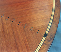 Walker's table establishes certain features that he will continue to use in future dining tables. Each one will have beautifully decorated surface created by sequential band-saw cuts of unusually thick veneer. The advantage of this veneer process is that it allows the best use of the most beautiful wood but, by being unusually thick, (1/8”), it also provides opportunity to refinish a daily used surface without fear of going through a delicate veneer.