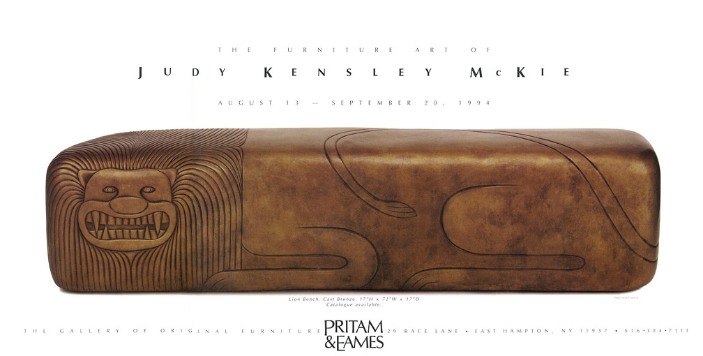 NOTES: This is the third one-person exhibit for Judy McKie that the gallery hosted, and it concluded a benchmark season. The announcement piece, the Jaguar Side Table, was the polychromed wood prototype for one of the two bronze edition pieces in this show. This is one of the few times that McKie includes a wood prototype in an exhibit. The other bronze, the Beast Bench, was introduced earlier and described as part of P&E's 10th anniversary exhibit in May, 1991. As said earlier, the Beast Bench remains one of McKie's strongest bronzes, one that exudes a primal, emergent force.
