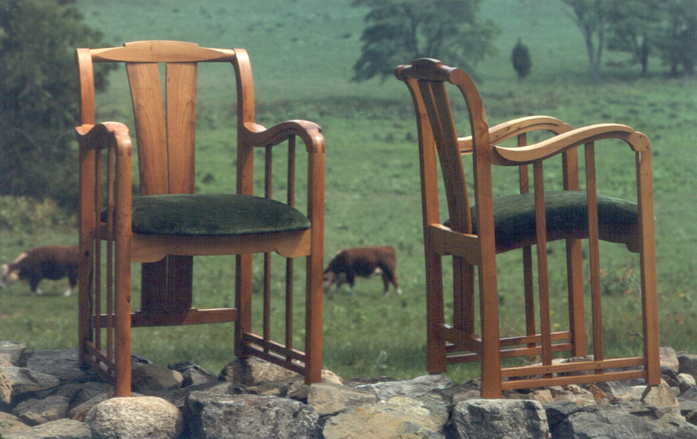 During this decade, it is not surprising that strong work from Hank Gilpin suddenly appears at the gallery. This was characteristic of the partners' relationship with him. The timing of the arrival of his work had less to do with the opening of a particular show or strength of the sales season, than when he could do it. In these three pieces we find both a repeated chair classic and a fresh, once-done bench: the chair a classic like a good oil painting; and the bench, fresh like a just-done watercolor. The yewwood chairs are one of a number of variants to come out of Gilpin’s Chinese-influenced, Arts and Crafts styled chairs. Here, note the back splat extends to a lower stretcher connecting the two rear legs. The arms of the chair say, “ Sit back in me,” and indeed this is a side chair rather than a dining chair. The height of the arms where the hands rest would conflict with many dining table aprons. But it is this delicious uplifting curve that gives this version of his chair its special personality.