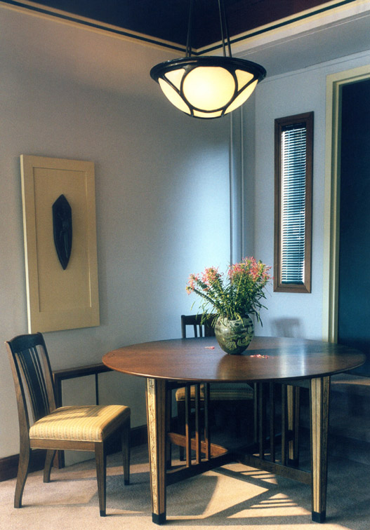The centerpiece of scale for this exhibit was Walker’s first dining room extension table. He called his previous table, shown at the gallery in 1987, a breakfast table. This time the table is a fully-fledged dining table with a set of eight chairs. And with this piece, Walker joins a small group of studio furniture makers willing to speculate on a piece of this scale. Richard Newman and James Schriber did so in the gallery's first decade and, although George Gordon, John Dunnigan, and Ron Puckett also made extension tables during this period, they did so on a commissioned basis.